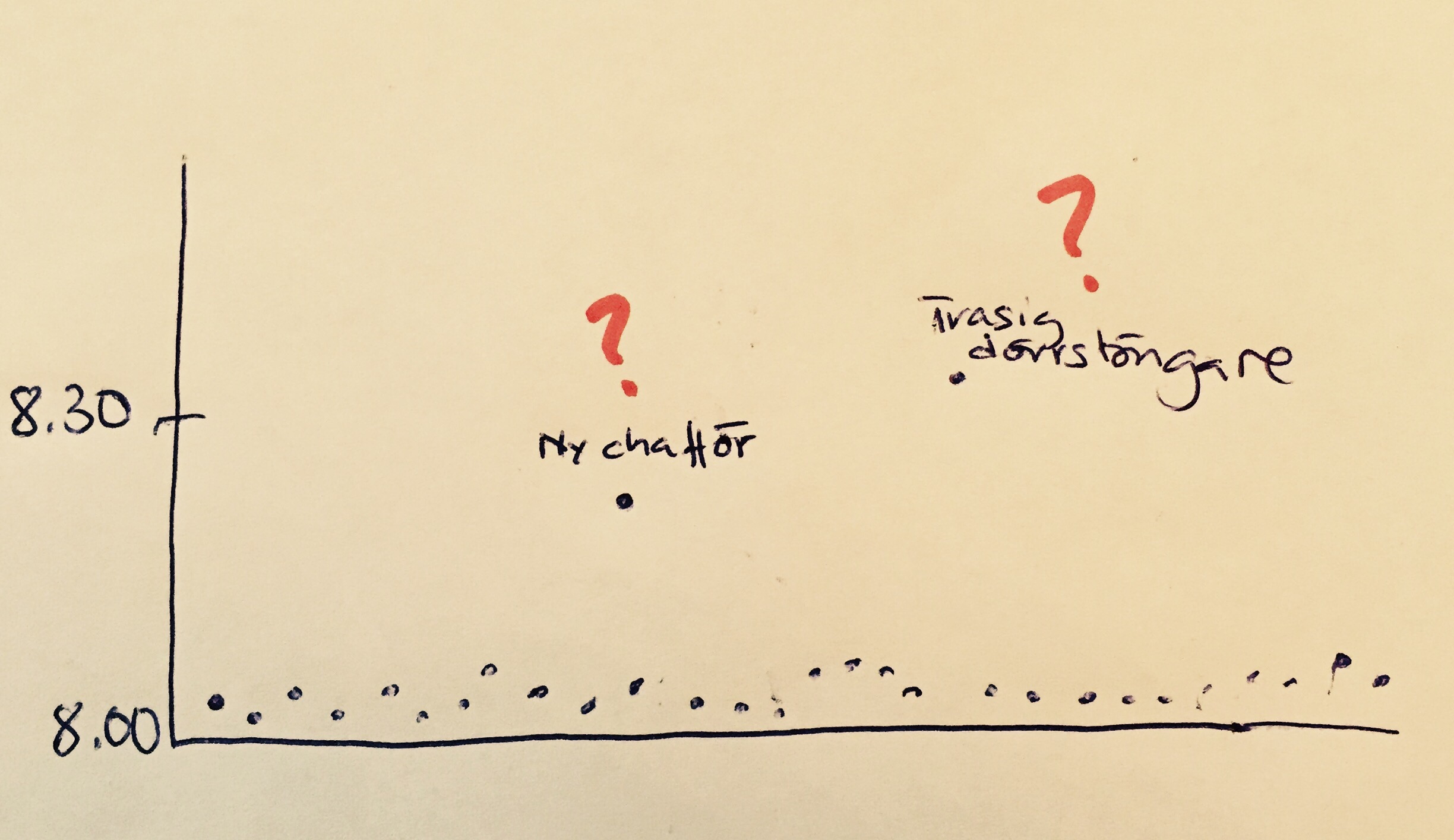 Av diagrammet kunde Patrick lätt se den normala variationen (bussen anländer vanligtvis några minuter efter åtta). Vid två tillfällen kom bussen betydligt senare, men variationen kunde förklaras – ny chaufför respektive trasig dörrstängare (sannolikt rätt ovanliga systemfaktorer som man kan bortse ifrån i ett förbättringsarbete, men skulle de dyka upp oftare borde det finnas incitament till förbättringar för bussbolaget).